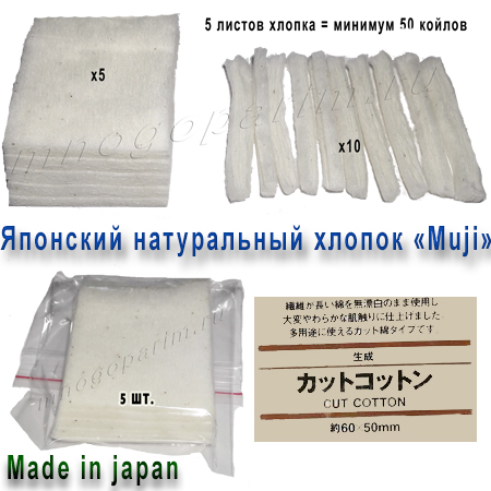 В упаковке 5 листов оригинального хлопка размером 6 х 5 см. Каждый лист можно порезать МИНИМУМ на 10 полосок для изготовления койлов. В итоге из 5 листов можно сделать МИНИМУМ 50 койлов.