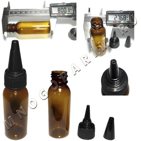 Пузырек "PET" (твердый, прозрачный пластик) коричневого цвета. Крышка из черного пластика состоит из 2-х частей (носик с резьбой и колпачок). Всю крышку не нужно откручивать, а только колпачок. Длинный носик идеален для заправки баков (Subtank mini) с большим входным отверстием. Тонированный цвет пластика защищает жидкость от опасного для нее ультрафиолета. Пузырек используется производителями для разлива жидкости премиум класса.